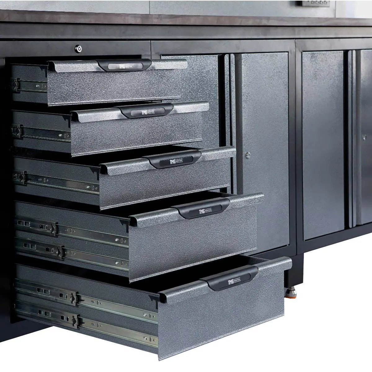 The TMG-WBC10 Extreme-Duty Steel Garage Beech Wood Workbench is a versatile, commercial strength tool storage and work surface solution for your home garage, repair shop, automotive business or any other industrial setting. Maximum storage possibilities through strategically placed pegboards and lockable slide drawers and cabinets of varying sizes. 10′ beech walnut finished work surface for long term smooth workflow that is resistant to scratches, impact and wear.