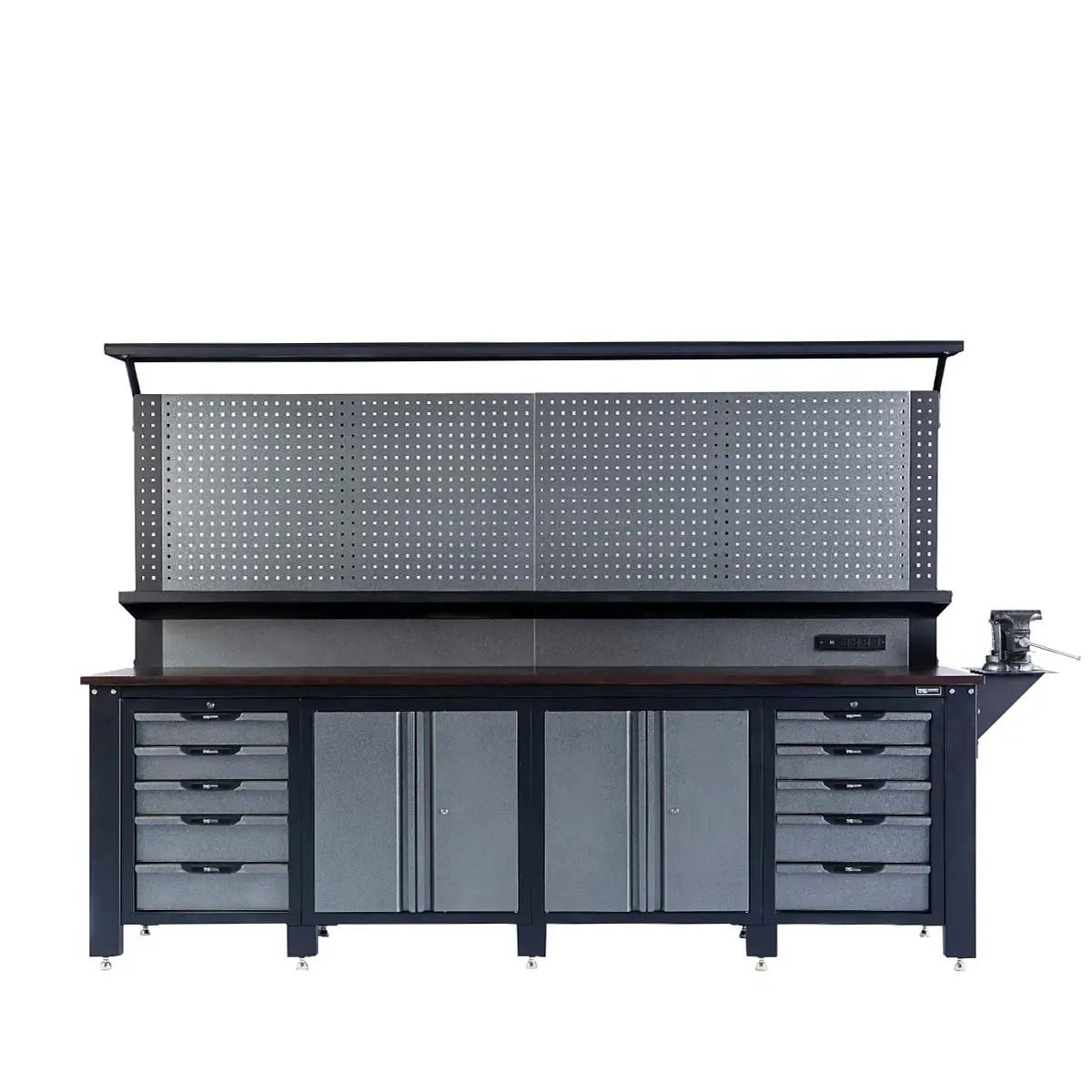 Equipped with pegboards on the interiors of all four cabinet doors as well as the outsides of the workbench in addition to a large main backdrop. Drawers come with 100 lb/300 lb capacity and individual locking mechanism for the protection of valuable tool and parts inventory. This workbench is designed for high-traffic commercial use and includes a table extension that could easily mount a vice on one end, four bench vices are included.