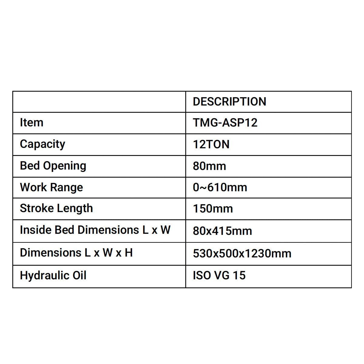 The TMG-ASP12 Hydraulic Shop Press is an essential piece of equipment for automotive shop, machining, metalworks, fabrication, or assembly operations. 12 tons of pressing capacity and a heavy duty H-frame makes pushing bearings onto shafts, stamp work, bending or flattening metal safe, efficient and easy to do.