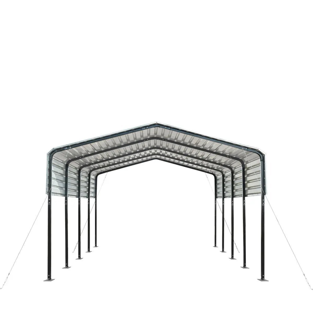 Heavy gauge galvanized metal with a powder coated finish protect this carport from the elements and make it highly resistant to rust, wear and corrosion. Robust metal roof and side panels have a surface polyester paint coating that provides another layer of protection which increases the lifespan and aesthetic quality. The vertical roof panels navigate moisture and help prevent snow buildup during the winter which decreases overall stress on the structure.