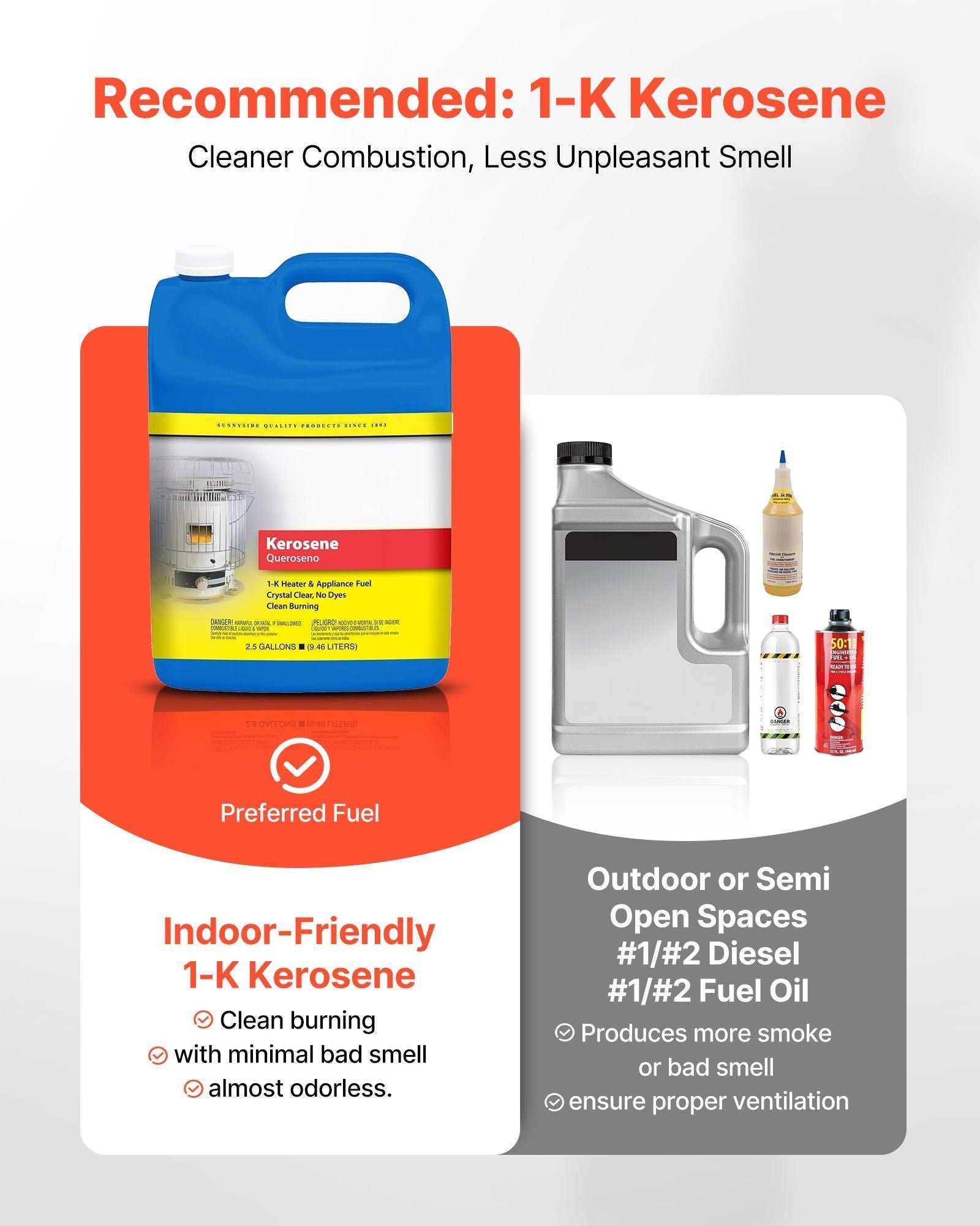 This kerosene forced air heater delivers rapid, even heat for large indoor spaces of 320–420 m², producing 125,000 BTU of output and operating at a low noise level of 70 dB. The adjustable thermostat allows precise temperature control from 41°F to 99°F (5°C–37.2°C) using an easy-to-read digital display and rotary knob, ensuring consistent warmth without overheating. Equipped with a 9.25-gallon (35 L) fuel tank, it runs continuously for up to 10 hours while consuming only 0.96 gallons per hour for efficient operation. For best results, use 1-K kerosene to achieve cleaner combustion, minimal odor, and improved reliability. Designed for convenience, this portable heater features durable bottom wheels for easy movement, letting one person effortlessly transport it wherever heat is needed.