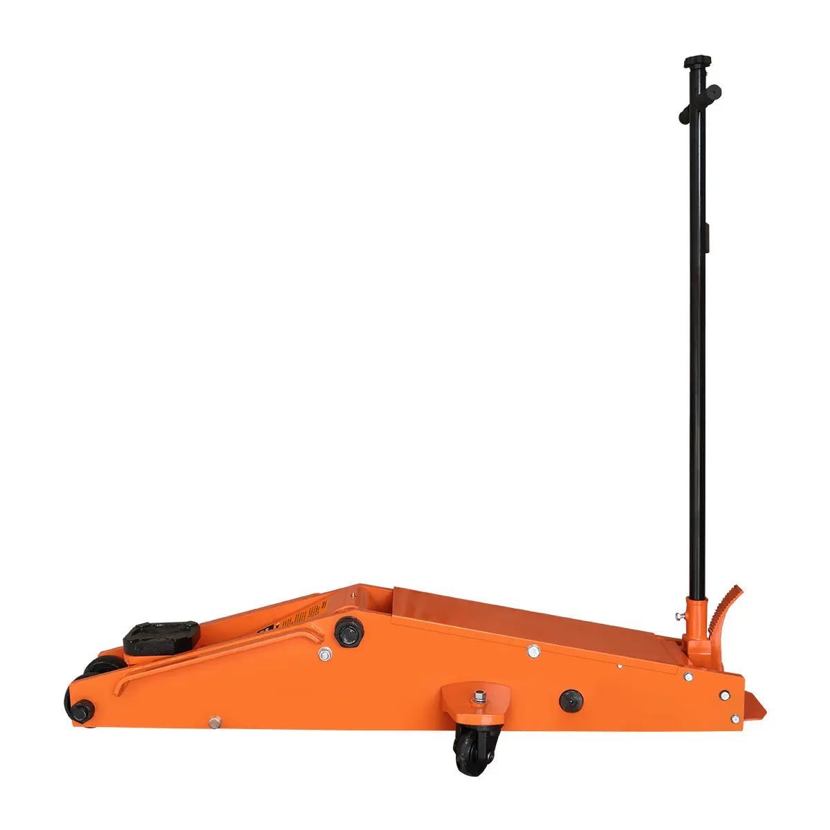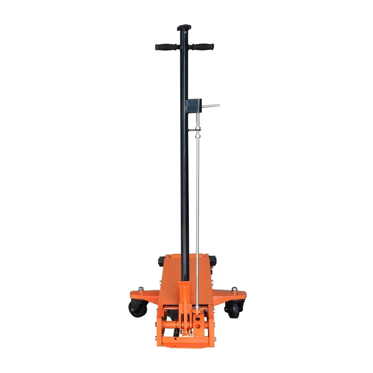 A sealed cast iron pump base operates twin pistons for faster rising action with a slowdown function for safety and controlled lifting under the chassis of the vehicle. The rear caster wheels pivot 360° for superior maneuverability, storage and positioning.