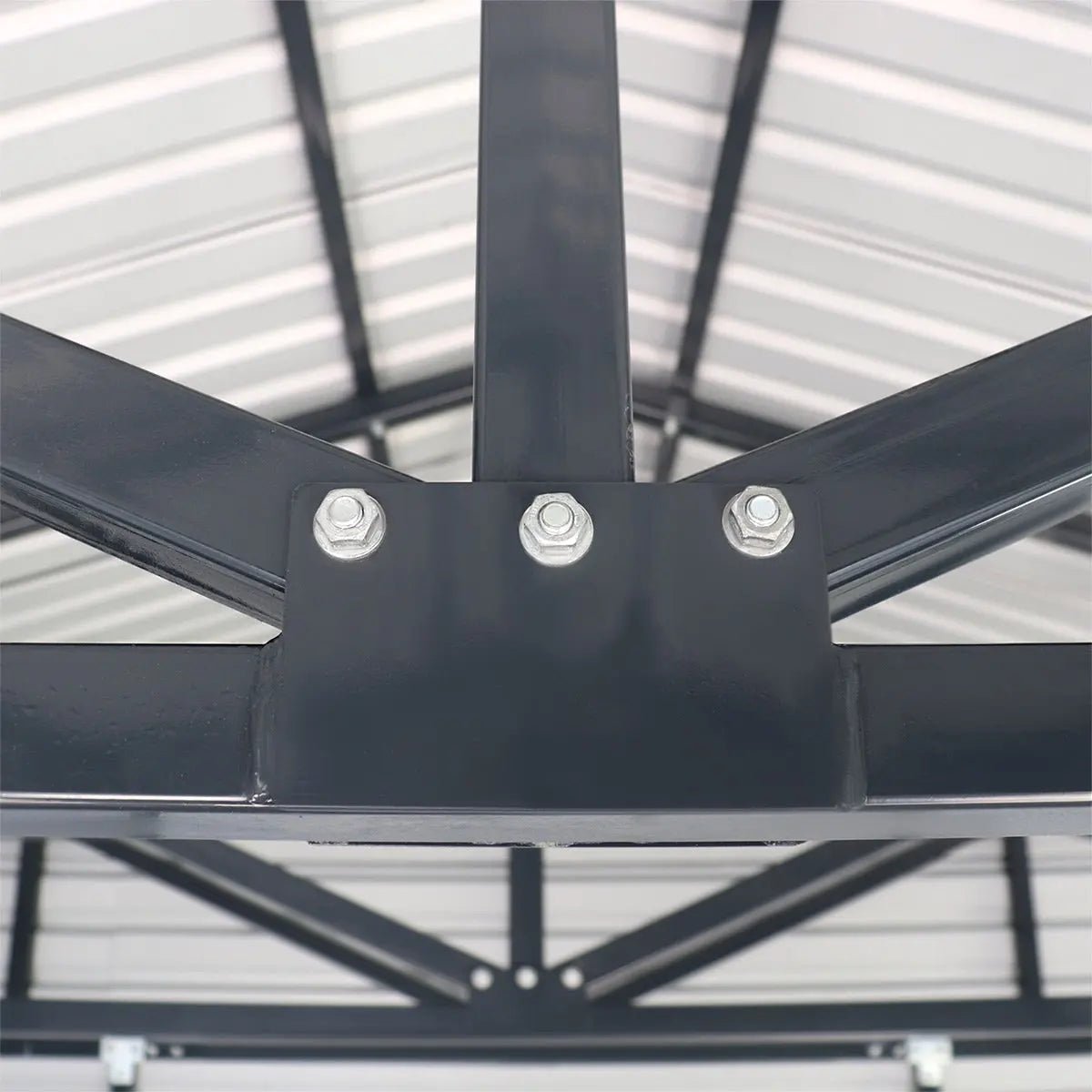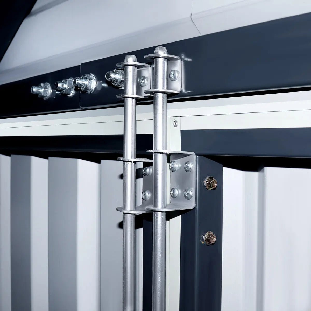 A sloped gable roof design prevents snow and water build up on those cloudy winter days. Slip-fit base frame with sleeve anchor bolts installation makes this structure easy to install on any solid wood platform or concrete slab. Immediately increase the value of your property by adding to it this metal shed which is only a fraction of the cost compared to building a similarly sized structure.