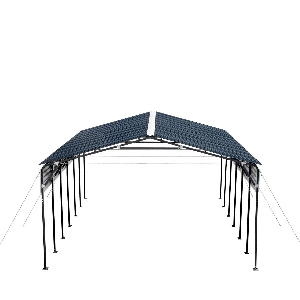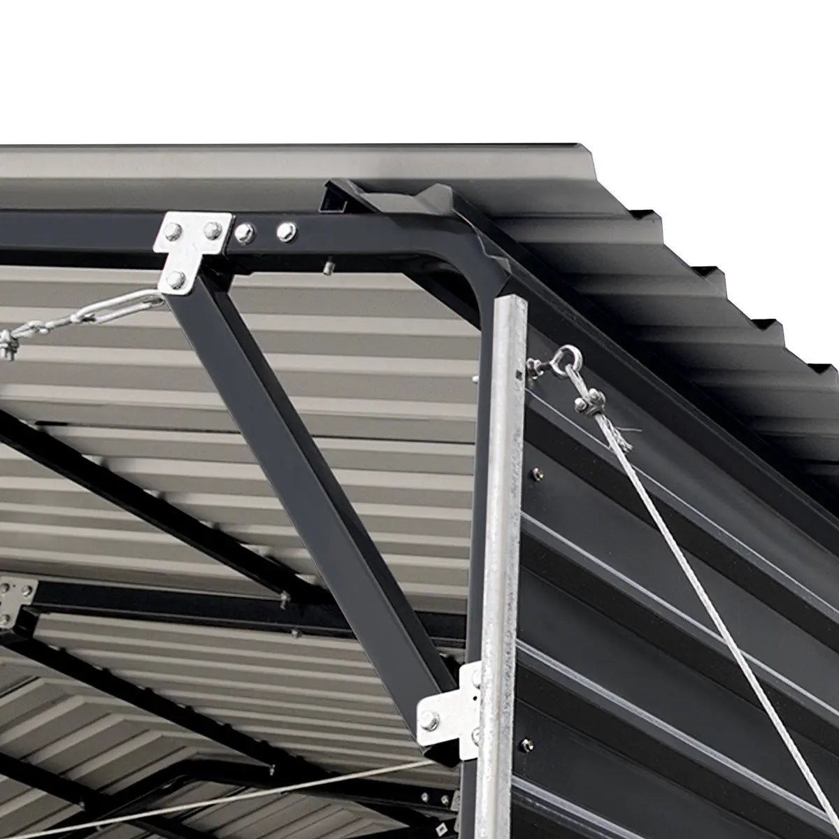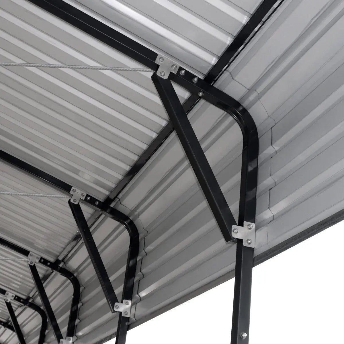 Over 1400 lb of heavy gauge galvanized metal with a powder coated finish protect this carport from the elements and make it highly resistant to rust, wear and corrosion. Robust metal roof and side panels have a surface polyester paint coating that provides another layer of protection which increases the lifespan and aesthetic quality. The vertical roof panels navigate moisture and help prevent snow buildup during the winter which decreases overall stress on the structure.