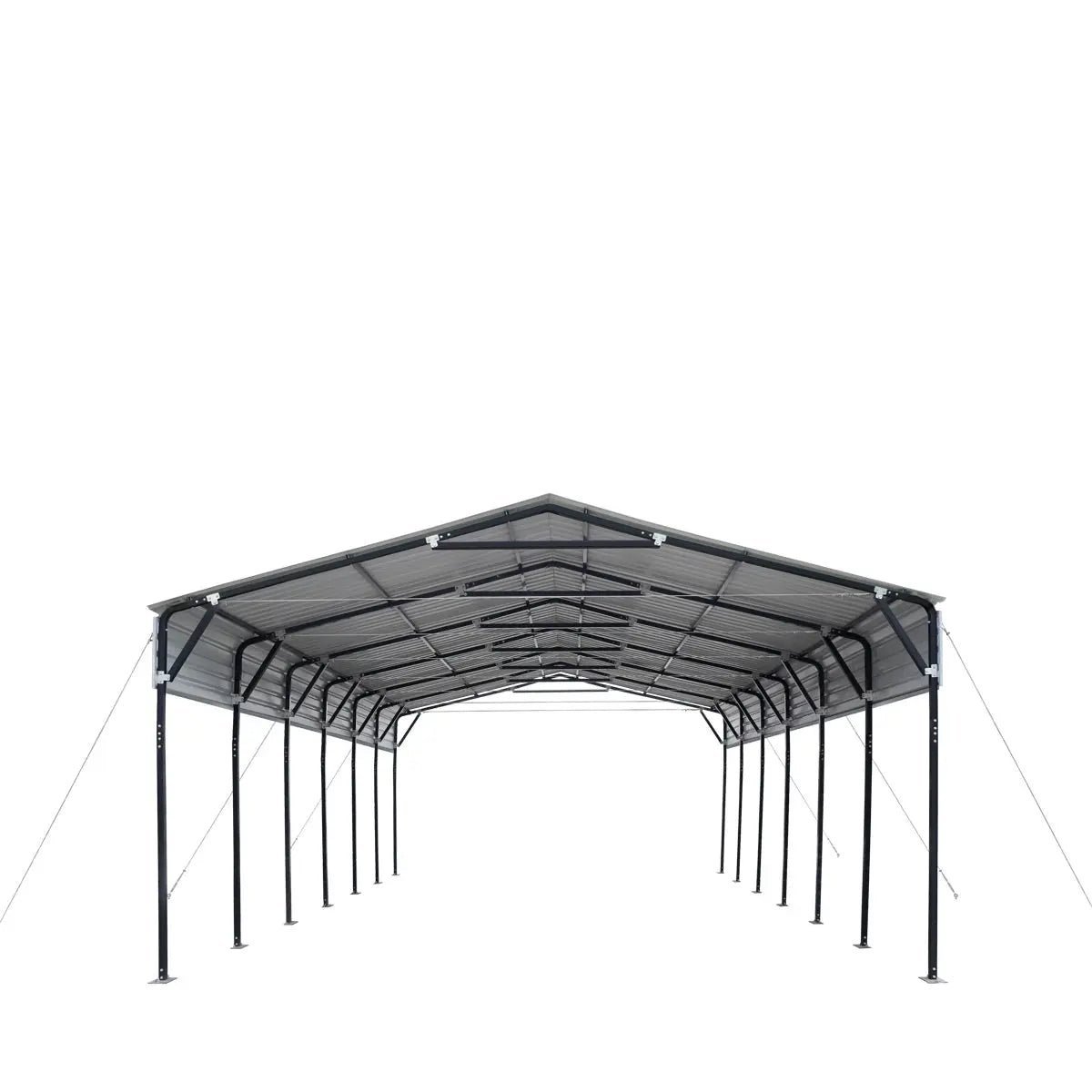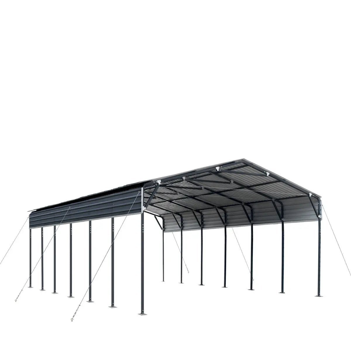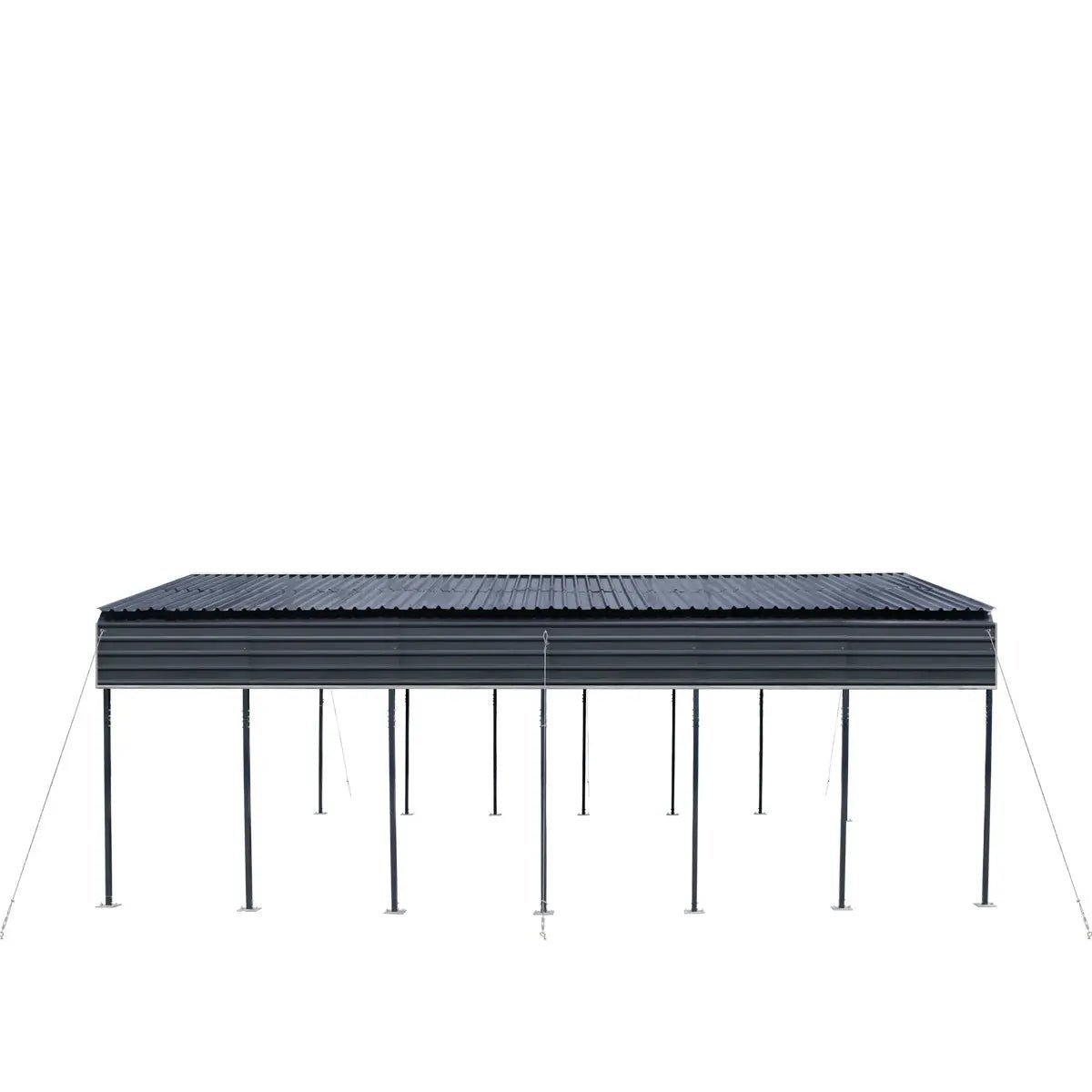 Over 1400 lb of heavy gauge galvanized metal with a powder coated finish protect this carport from the elements and make it highly resistant to rust, wear and corrosion. Robust metal roof and side panels have a surface polyester paint coating that provides another layer of protection which increases the lifespan and aesthetic quality. The vertical roof panels navigate moisture and help prevent snow buildup during the winter which decreases overall stress on the structure.