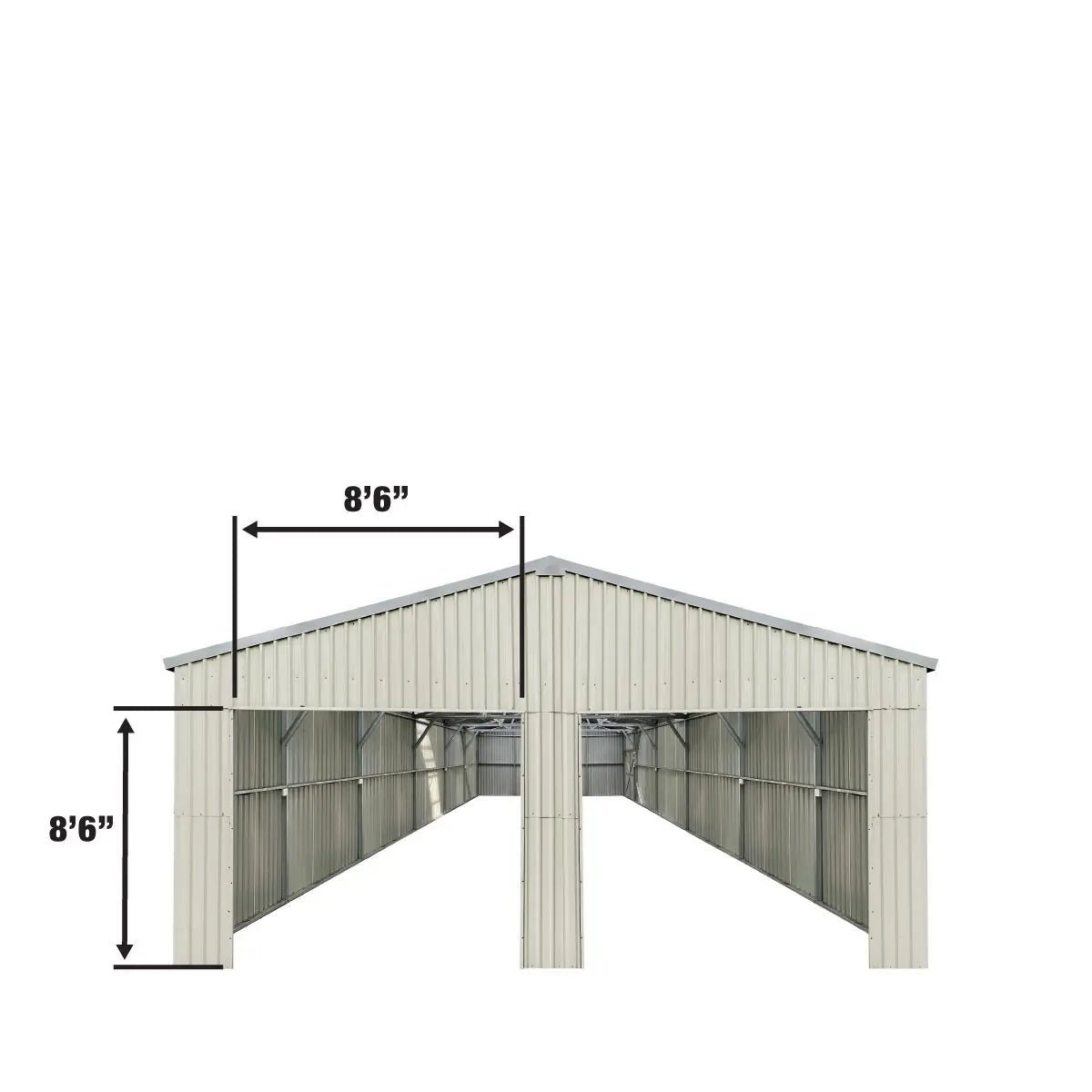 Our metal garage has reinforced roof supports, wall bracings and a lightweight C-channel steel construction making it a dependable structure for the housing of all your valuable goods. It’s built to last and capable of accommodating your needs with approximately 1025 sq-ft of floor space that could be used as a covered outdoors woodworking or mechanic’s shop. Fitted with galvanized, corrugated metal sheet panels and polyester paint that offer protective resistance against corrosion, rust and wear. Stockpile extra lumber, piping, motorized machinery and power tools; anything you need to help get the job done.
