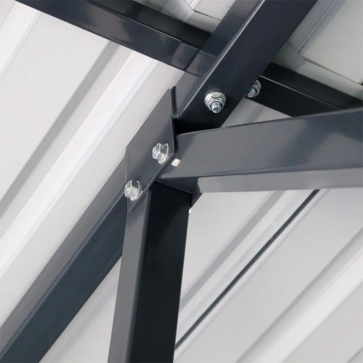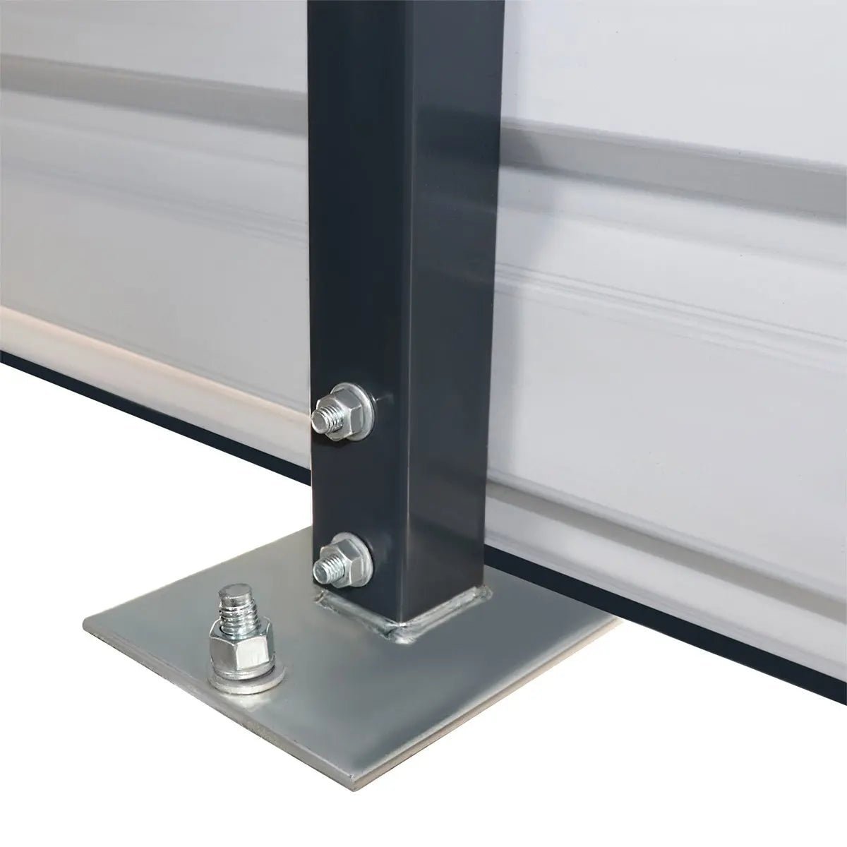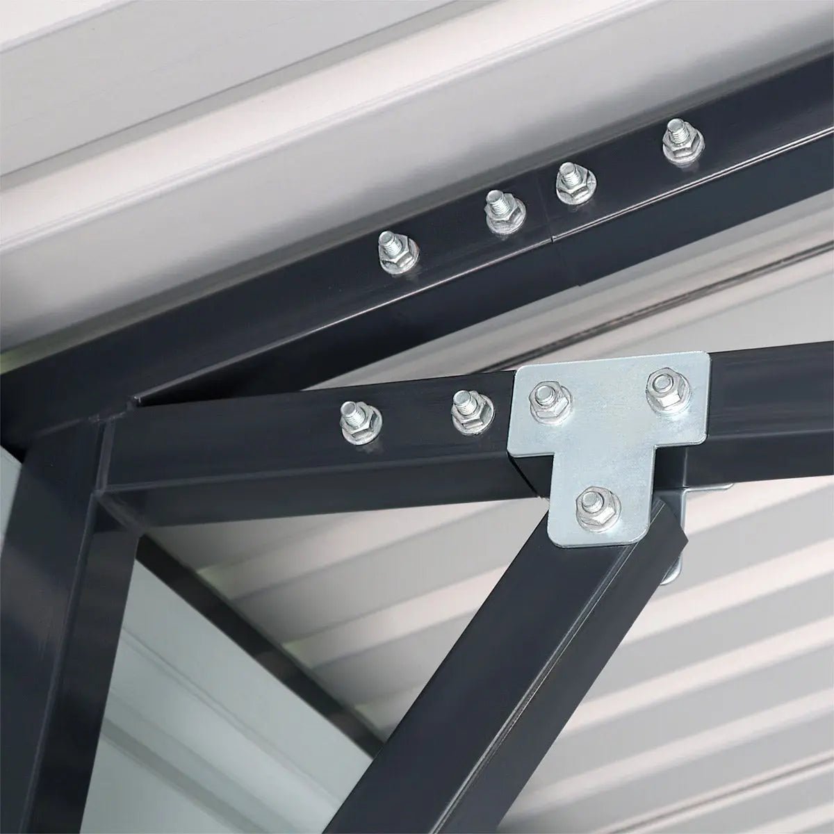 A sloped gable roof to help prevent snow and water build up on those cloudy winter days. Slip-fit base frame with sleeve anchor bolts installation makes this structure easy to install on any solid wood platform or concrete slab. Immediately increase the value of your property by adding to it this metal shed which is only a fraction of the cost compared to building a similarly sized structure.