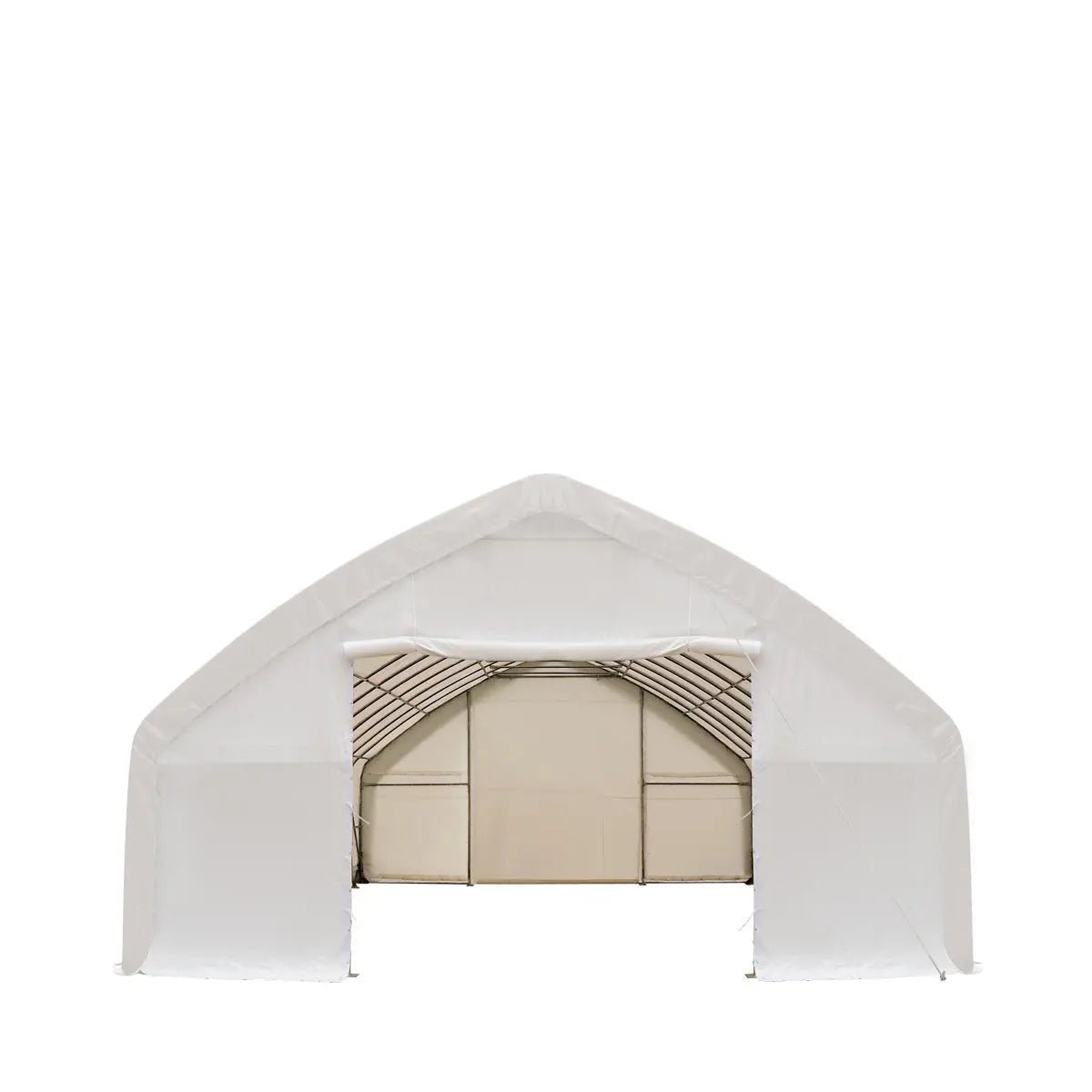 The TMG-ST3050V PVC Fabric Peak Ceiling Storage Shelter provides an easy to assemble, durable outdoor storage solution or workshop for your farm, construction site, equipment dealership and more.