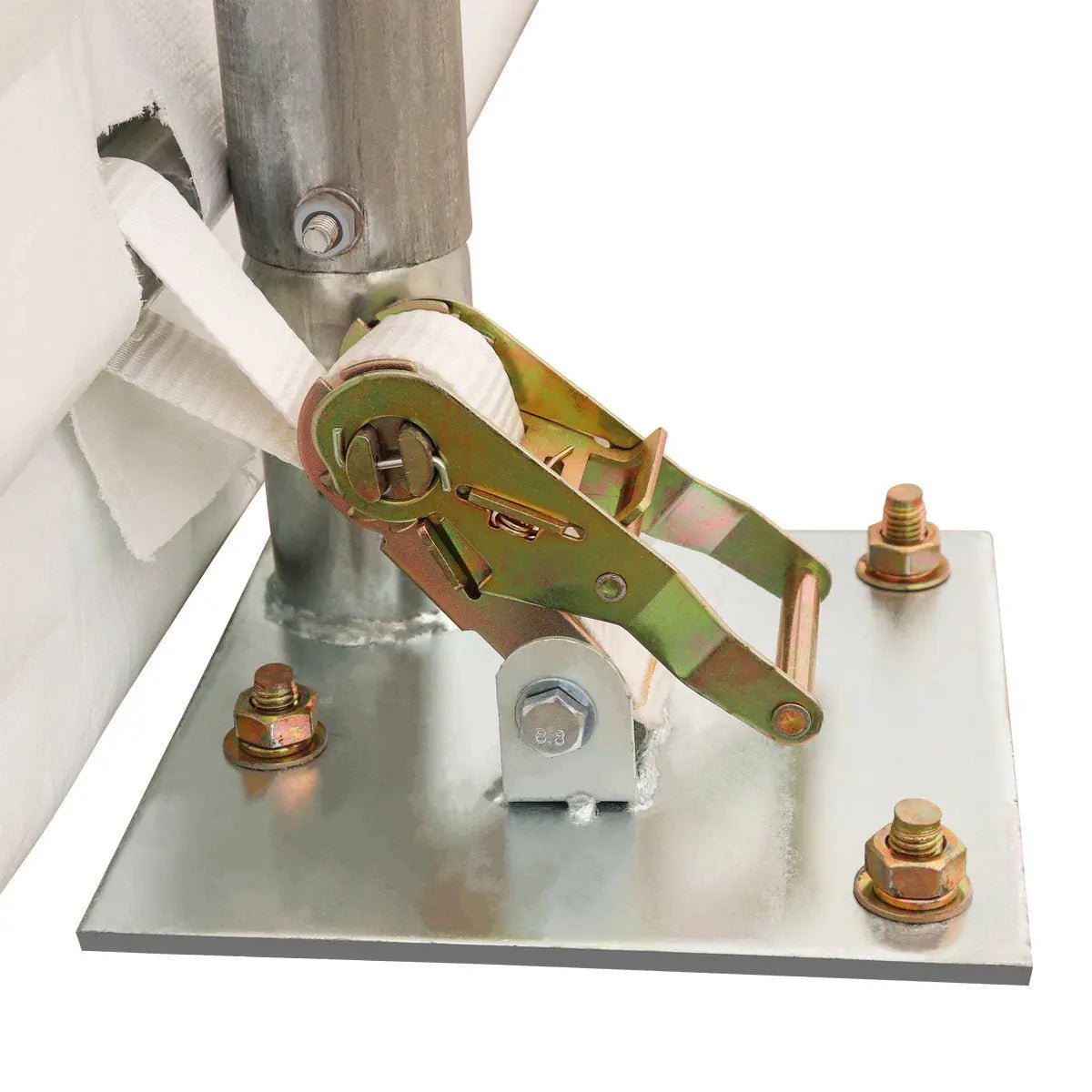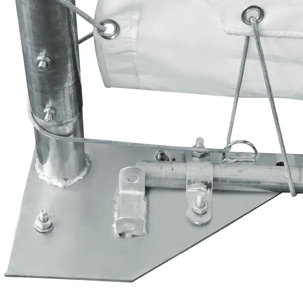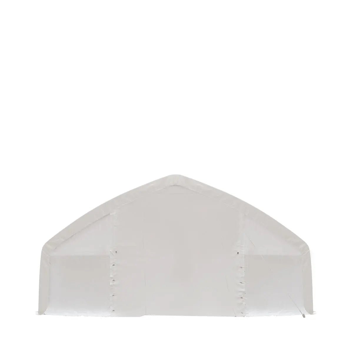 Made of strong, heavy-duty commercial grade polyvinyl chloride (PVC) fabric that is triple layered to prevent tearing and provide a long-lasting shelter covering for many years to come. This fabric is a natural flame retardant, commonly used in large commercial structures such as sports stadiums and event halls. The first 7 ft of each side is a straight wall which amplifies storage space along the edges. 126 roof purlins also run throughout the whole interior of the structure which reinforces it for exceptional durability and stability.