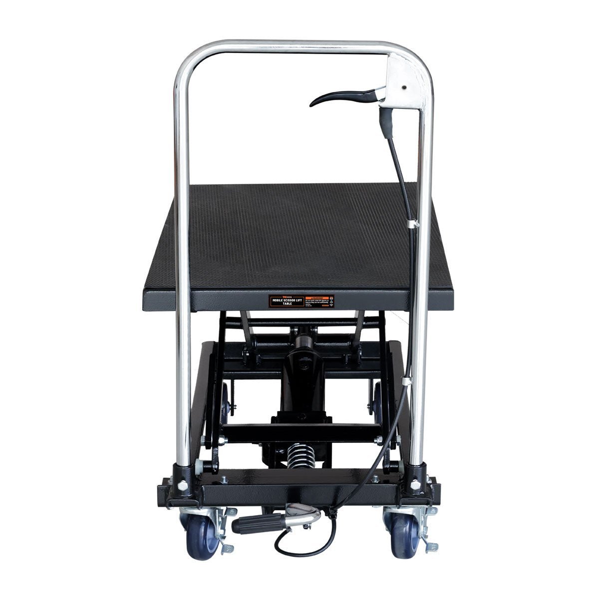 A foot pedal allows you to operate the hydraulic tabletop with ease, and lowers the risk of injury by eliminating the need to bend down and manually adjust objects. Simply pump the table up to your desired height, and use the conveniently located handle-mounted pressure release to have total control over the descending speed.
