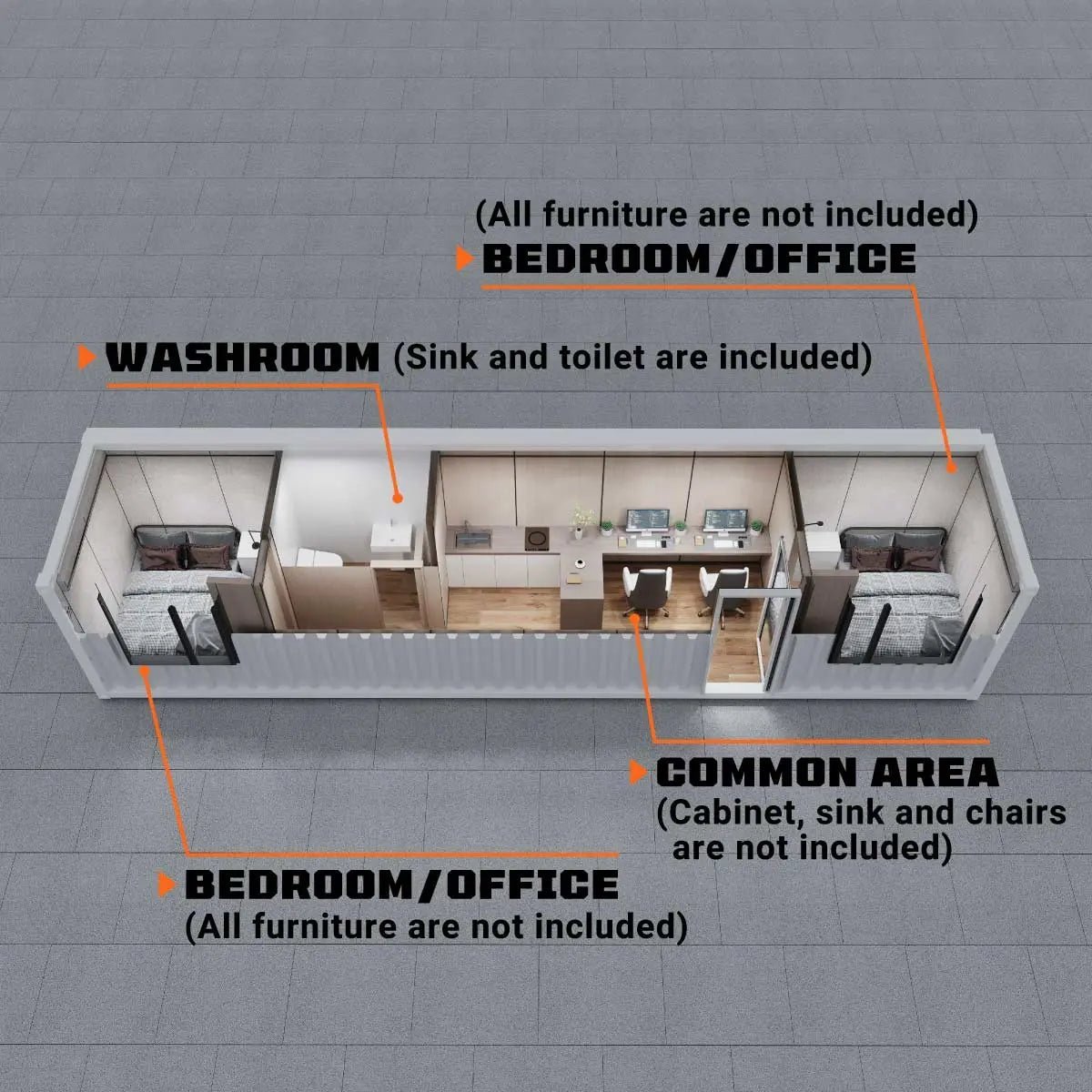 The 40′ heavy-duty galvanized steel frame is durable and strong, ensuring a safe and secure workspace. Inside, you’ll find a thoughtfully designed layout that includes environmentally friendly wood grain wallboard, PVC flooring, and robust doors with aluminum frames and triple-layer glazed tempered glass windows. The horizontal pivoting windows allow for ventilation even on rainy days, and its high-density foam insulation guarantees optimal temperature control, making it suitable for any location and climate.