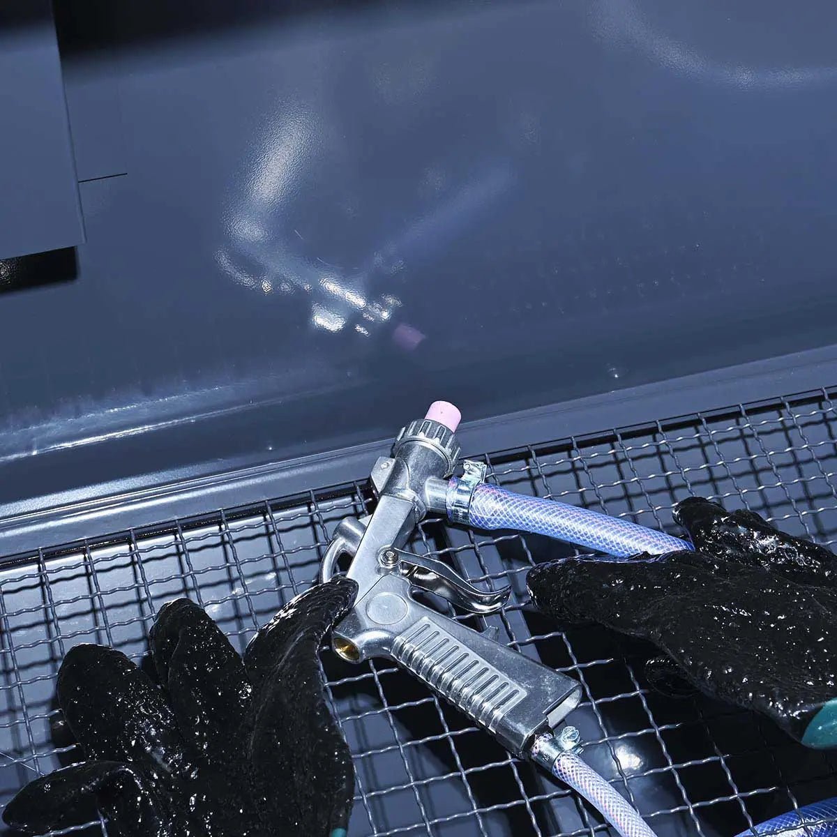 Compatible with various abrasive materials and comes included with a blasting gun and multiple nozzle sizes to accommodate your needs. Perfect for repair shops, parts departments, restoration and many other commercial and personal abrasive cleaning applications.