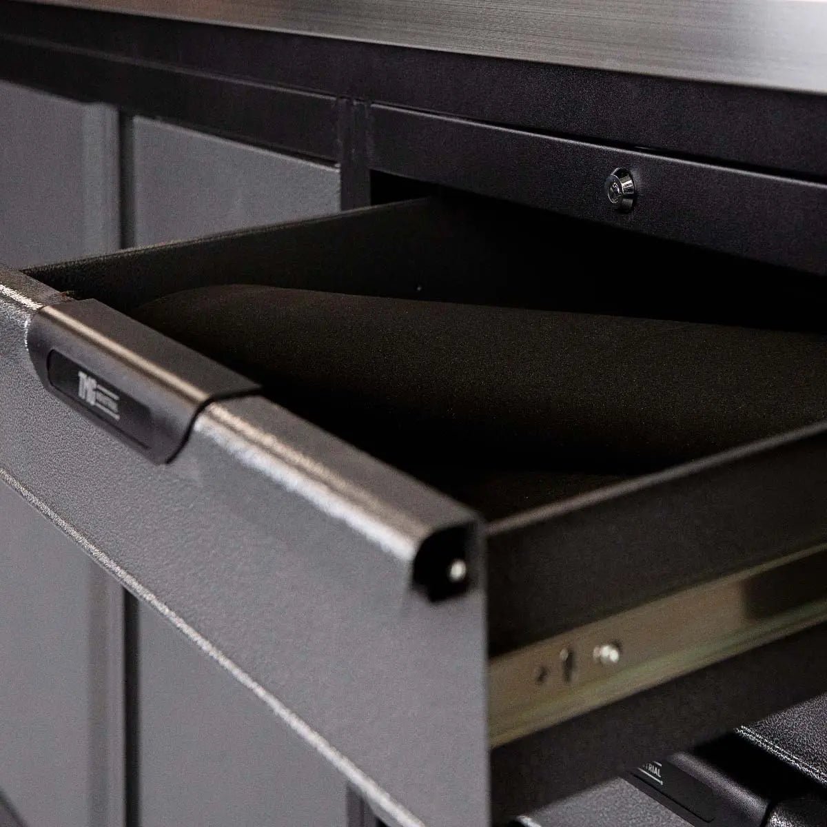 The TMG-WBC07 Extreme-Duty Steel Garage Workbench is a versatile, commercial strength tool storage and work surface solution for your home garage, repair shop, automotive business or any other industrial setting. Maximum storage possibilities through strategically placed pegboards and lockable drawers and cabinets of varying sizes. Over 7′ stainless steel bench with 1-½” solid wood underneath for long term work capacity that is resistant to scratches, impacts and wear.