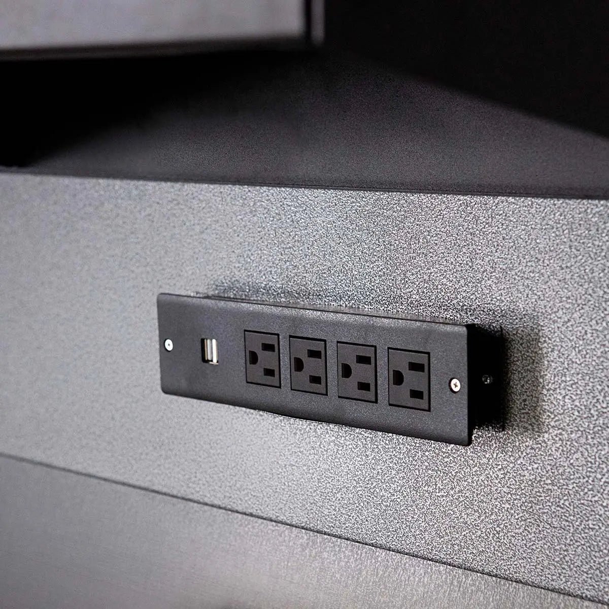 Two additional shelving units are installed overhead and above the main work space for optimized storage and utility. Integrated power bar with USB port makes for efficient tool battery or phone charging, and also included are the magnetic LED motion sensor lamps for precise work table accuracy.