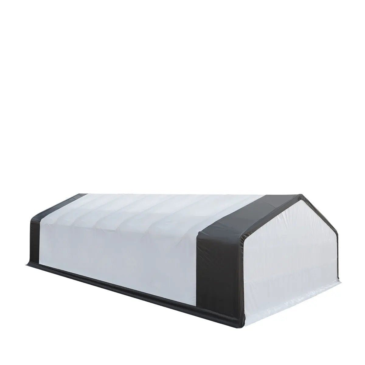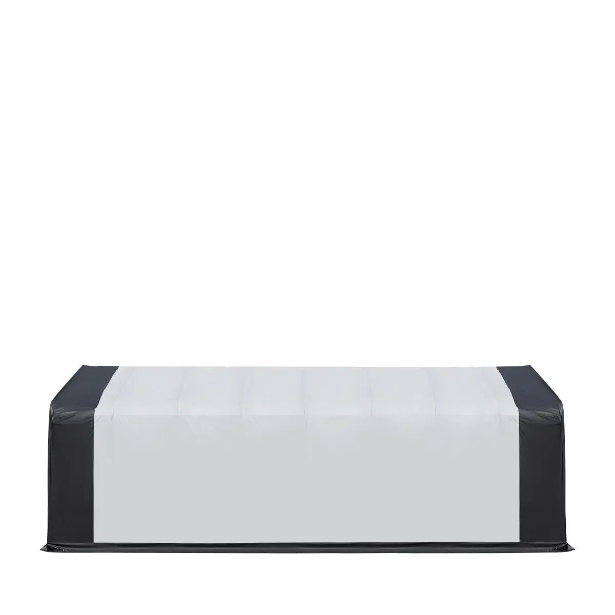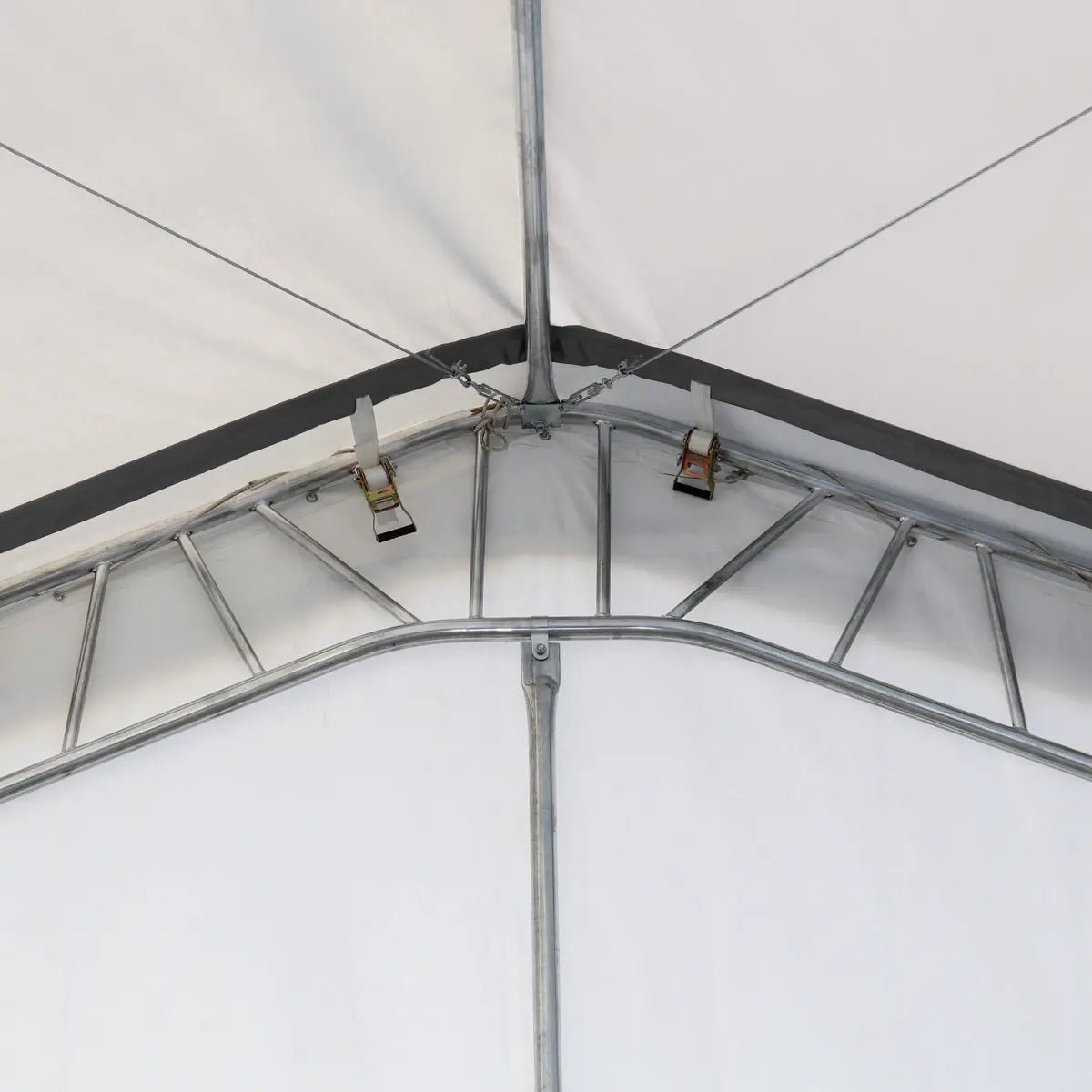 The commercial grade 21oz PVC cover, colored in a clean white with grey trims, offers superior protection against tearing, leaking, and chemical corrosion. The shelter is fire-retardant, UV-protected, and waterproof, guaranteeing a dry and organized space.
