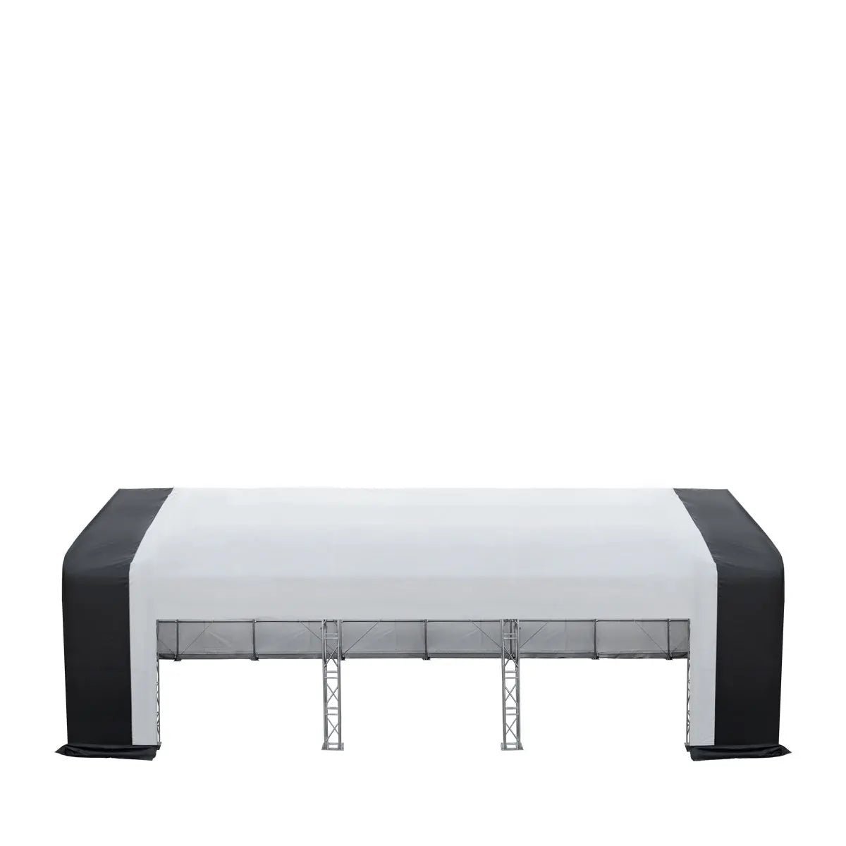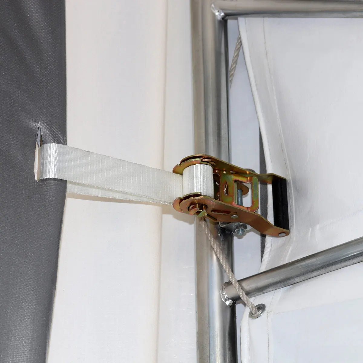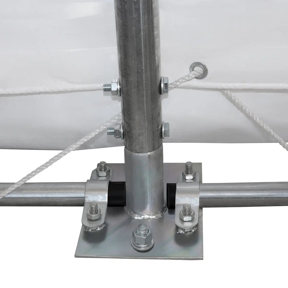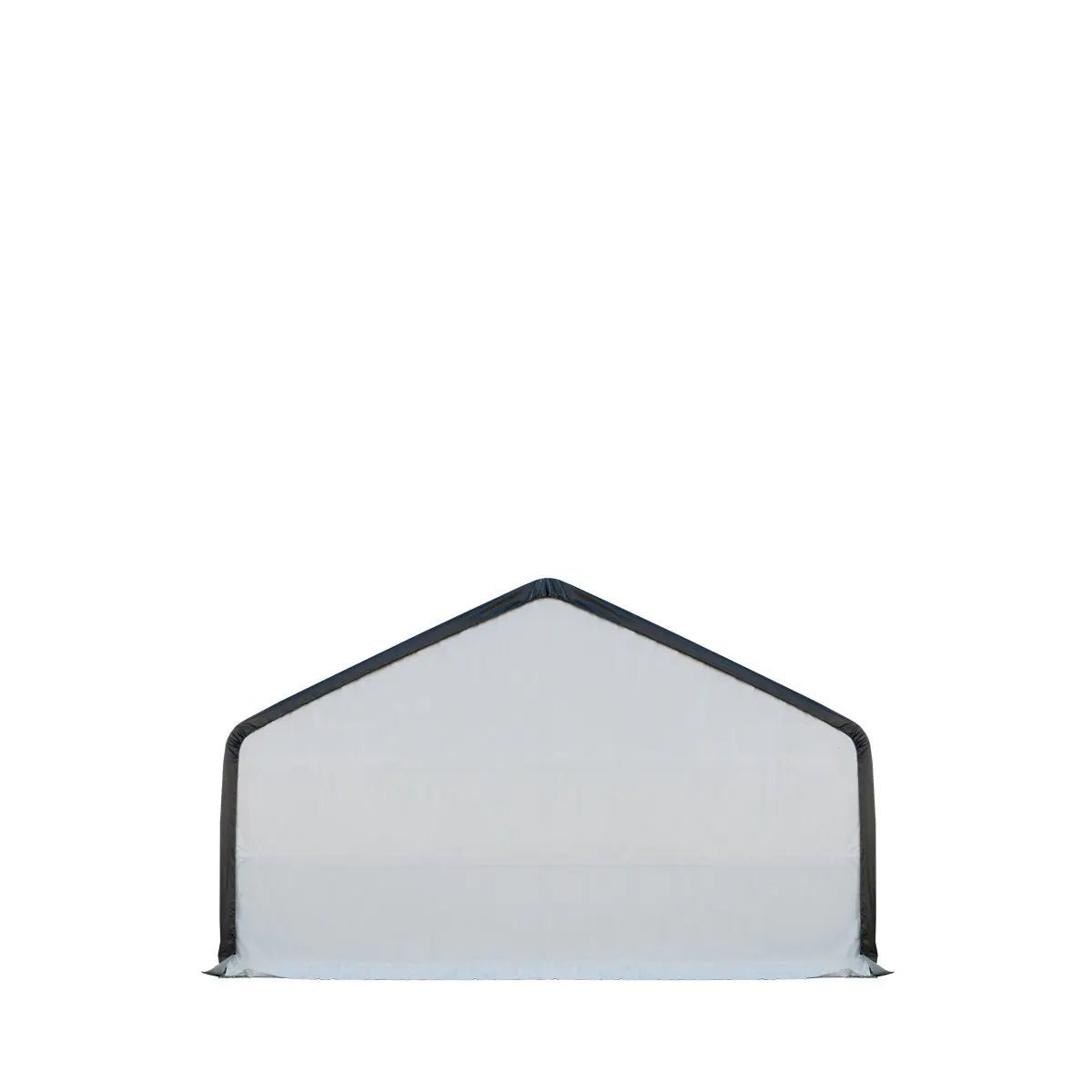 The commercial grade 21oz PVC cover, colored in a clean white with grey trims, offers superior protection against tearing, leaking, and chemical corrosion. The shelter is fire-retardant, UV-protected, and waterproof, guaranteeing a dry and organized space.