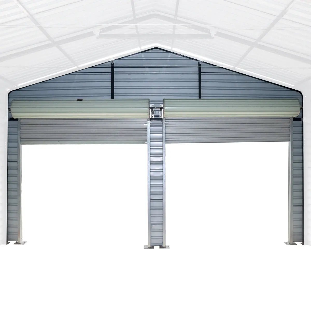 A built-in three foot wide entry door in the back offers a convenient in-and-out option for personnel entry and exit without having to open the roll-up doors. Constructed with 27 GA corrugated steel panels that have a polyester paint coating to help protect them from the elements.