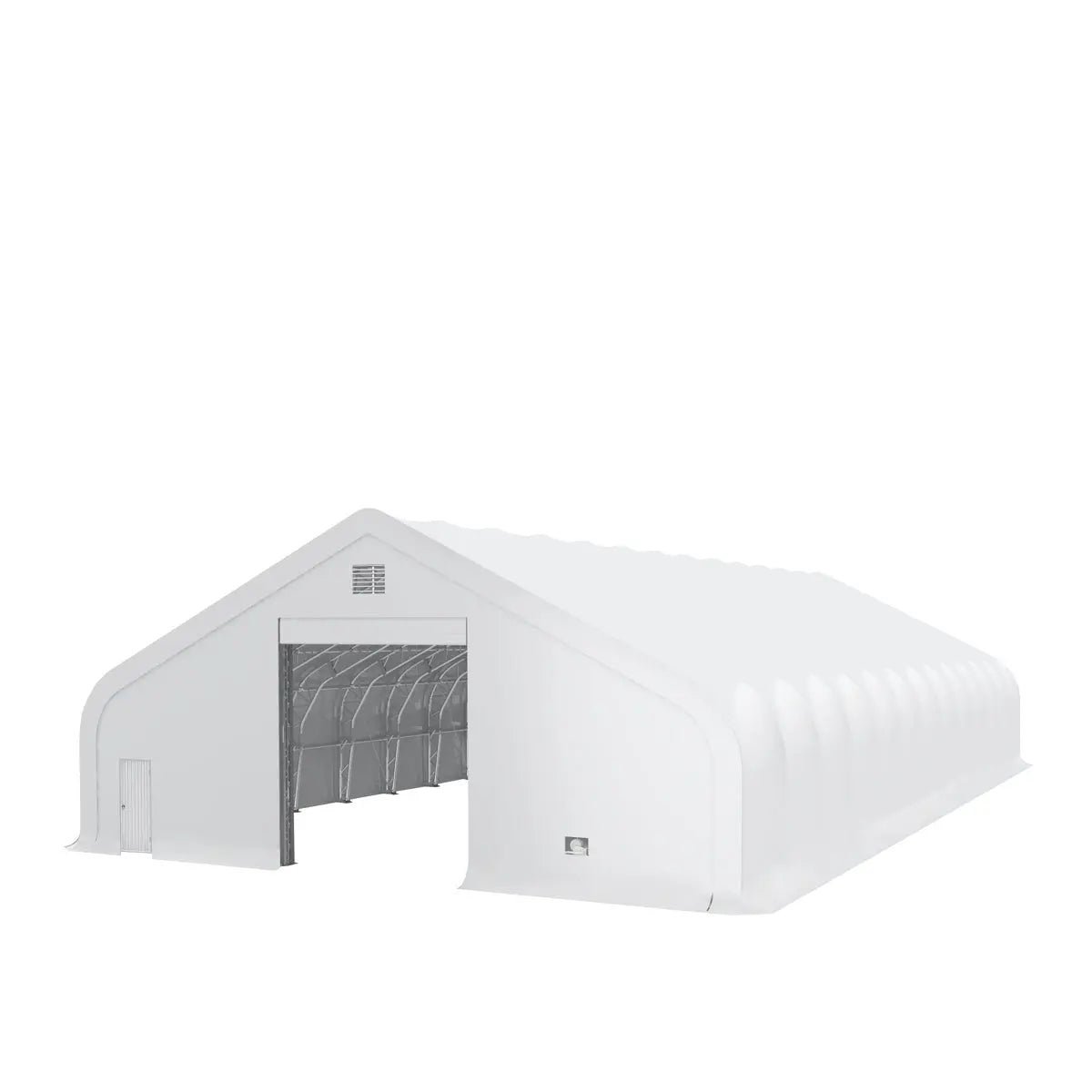 The TMG-DT50100-PRO PVC Fabric Peak Ceiling Storage Shelter provides an easy to assemble, durable outdoor storage solution or workshop for your farm, construction site, equipment dealership and more. Approximately 5000 square feet of covered space to stockpile materials, work on projects, park vehicles and accommodate all other needs big or small. Able to install on any concrete pad or equivalent for versatile useability whether you’re working in remote, rural or industrial locations.