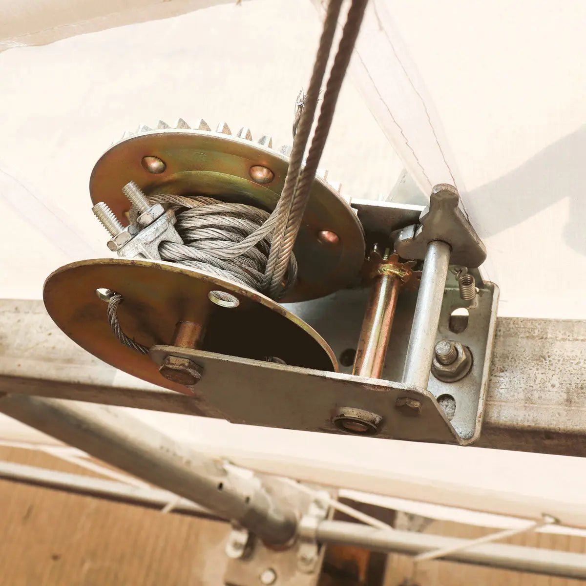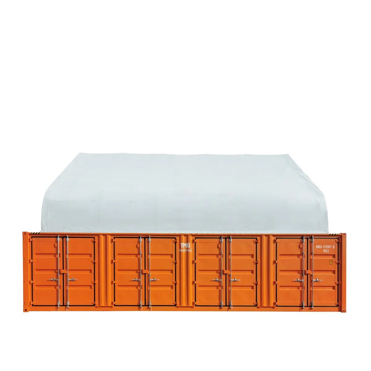 Made of strong, heavy-duty commercial grade polyvinyl chloride (PVC) fabric that is triple layered to prevent tearing and provide a long-lasting shelter covering for many years to come. This fabric is a natural flame retardant, commonly used in large commercial structures such as sports stadiums and event halls. The enclosed end wall and front drop provide an extra layer of protection for your machinery and weather sensitive cargo. End wall is designed for standard 40′ GP containers; a 14″ base will need to be added if using HC containers.