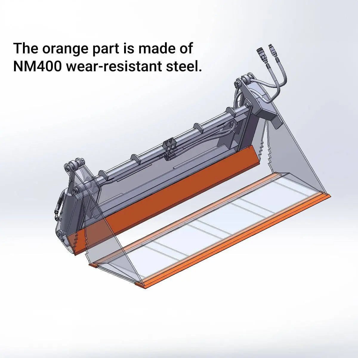 The TMG-SBF72 Skid Steer 4-in-1 Bucket is crafted for universal skid steer connections. Engineered with a tough NM400 steel blade, it offers a spacious 0.35 M³ (12-¼ cu-ft) bucket capacity to handle various tasks with ease.
