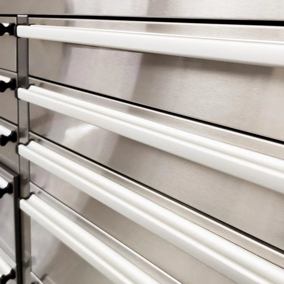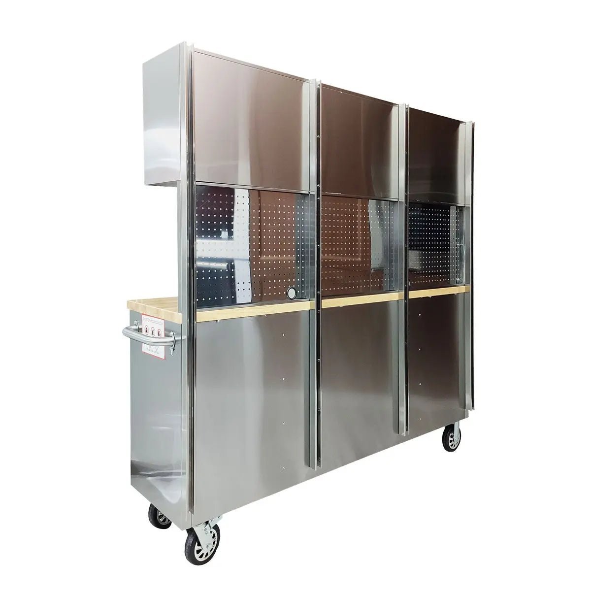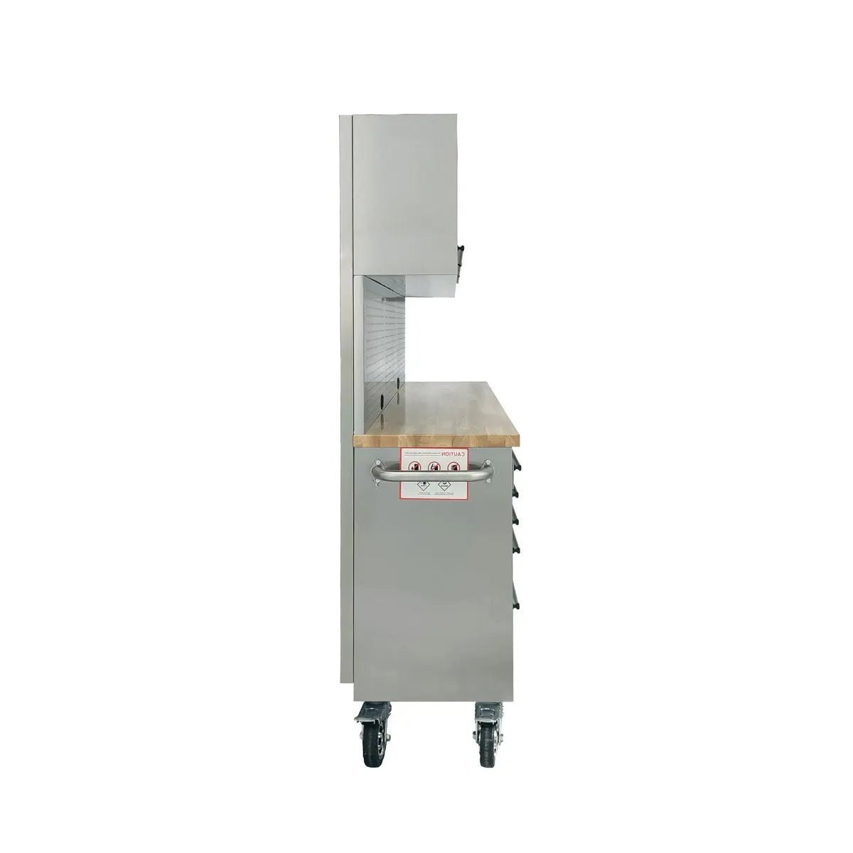 This bench features 15 heavy-duty lockable sliding drawers and top mounted storage cabinets with adjustable shelving. The security and mobility of this workbench make it incredibly adaptable to any kind of professional work environment and is built to last with a powder coated finish.