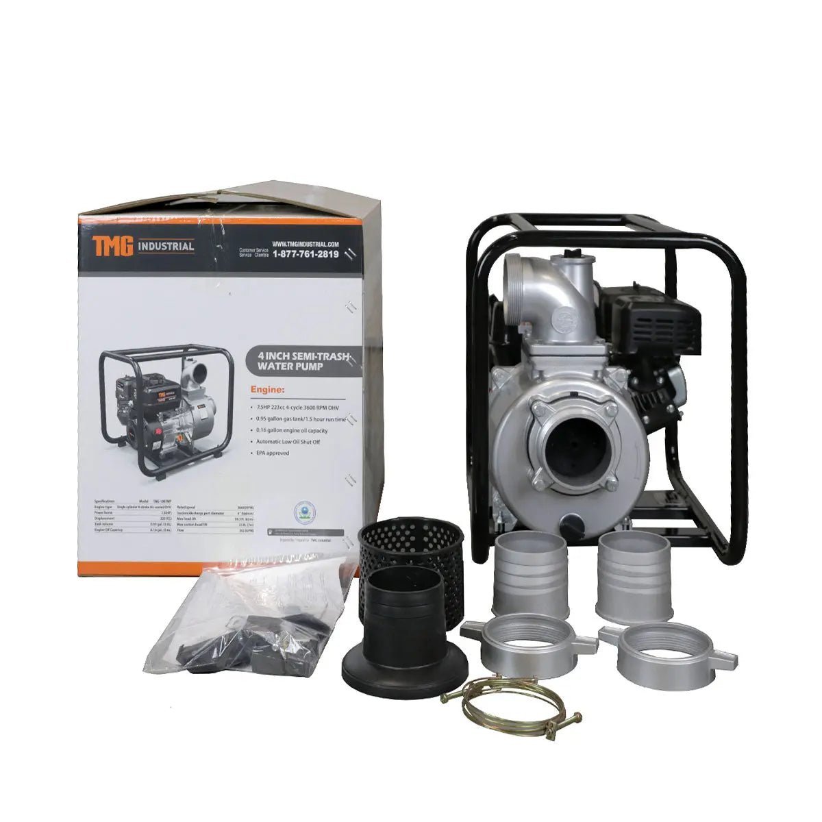 The TMG Industrial 4” semi-trash water pump is designed to allow small debris up to the size of a dime to pass through the cast iron impeller pump without clogging. Commonly it is used to pump clear, slightly muddy or sandy water. The machine features a powerful 7.5 HP gas engine capable of moving 352 GPM. Included in the box is a hose filter designed to handle water with mud, leaves, sand, sludge, and small twigs, ensuring uninterrupted use. A full cage protects the engine and pump, allowing for use in rough environments and a 3.6L gas tank provides 2.5 hours of runtime. The hose end connectors are made of quality metal to increase the operating lifespan and provide a reliable seal.