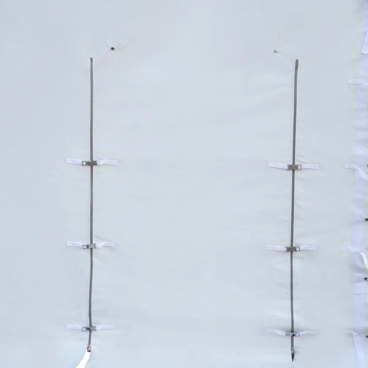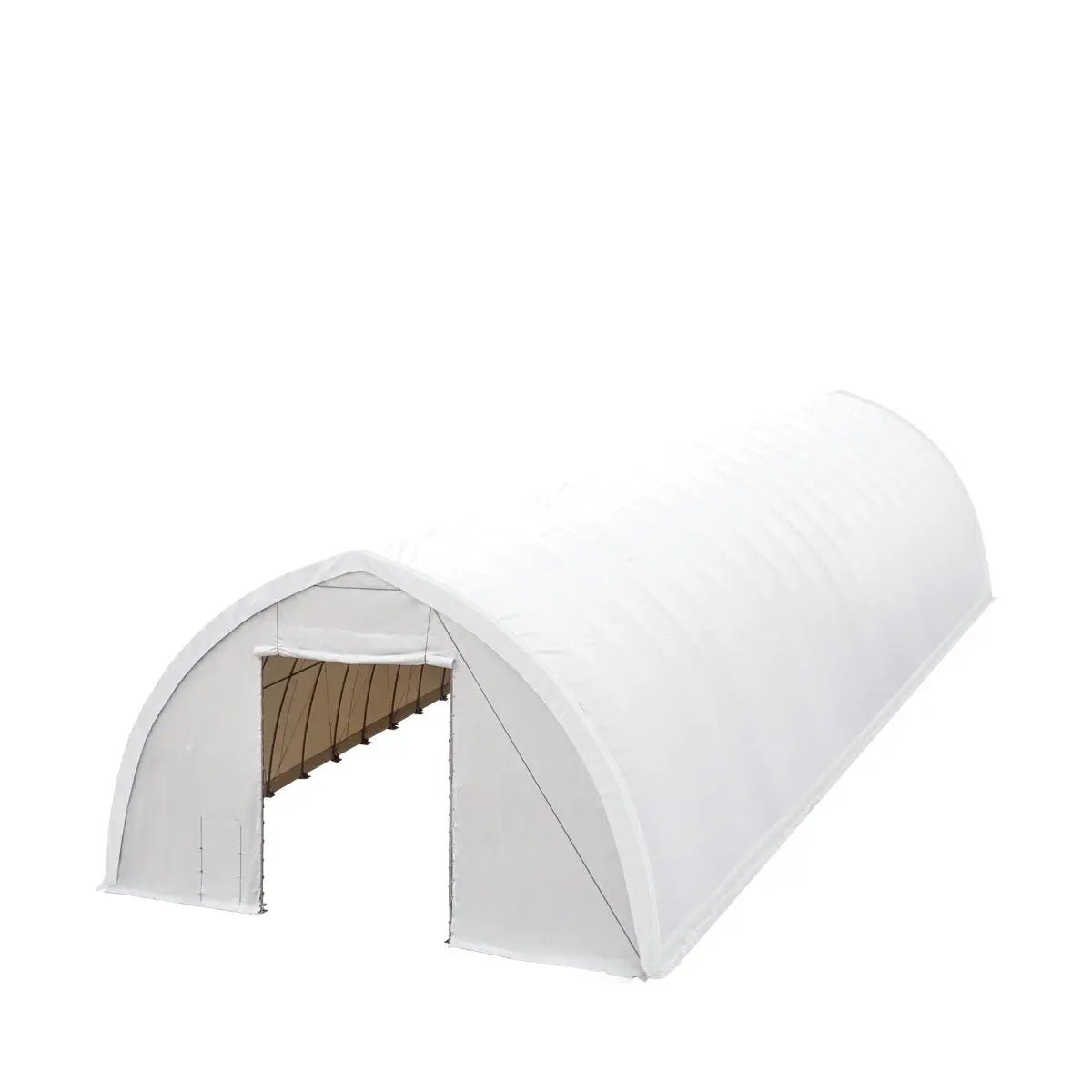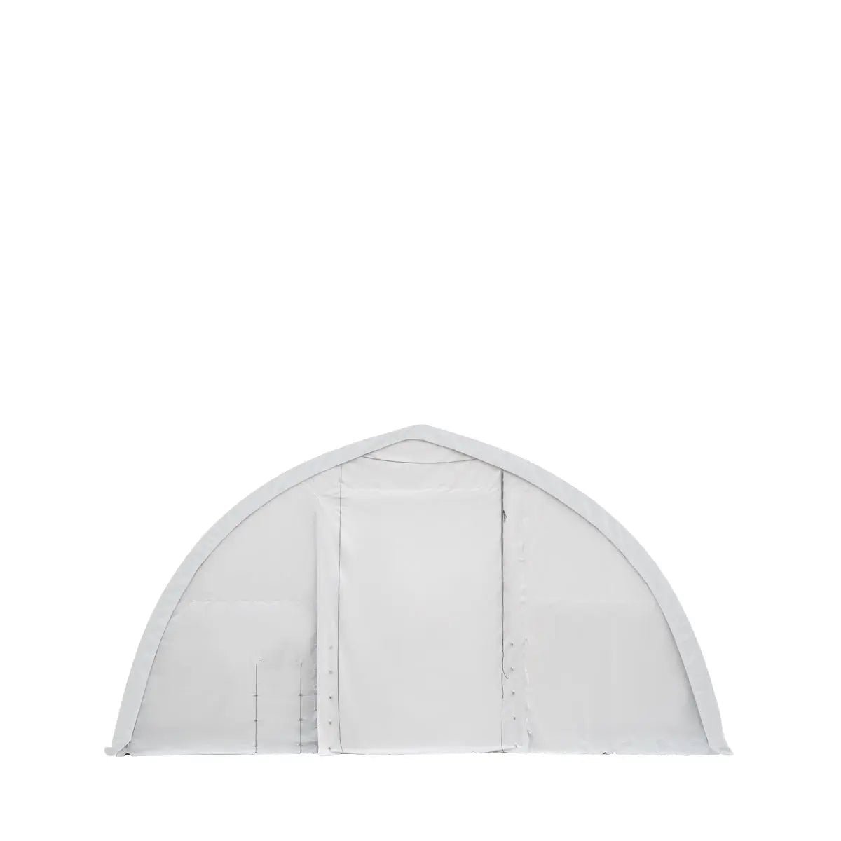 The TMG Industrial 40 x 80 ft Peak Ceiling Storage Shelter features a heavy-duty 17 oz PVC fabric cover that is treated to be fire retardant, UV resistant, and water-resistant. The peak style structure is made of commercial-grade galvanized steel tubes that are designed to be long-lasting and relatively easy to assemble. A dirt skirt along both long sides helps protect against crosswinds, giving this shelter increased durability. Both ends feature a door with an opening 13 ft wide by 16 ft high. This shelter is great for cars, SUVs, boats, and ATVs, as a small shop, for storing farm equipment, and much more.